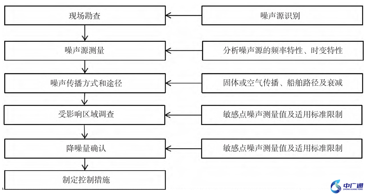 噪声治理的总体思路如下:噪声控制应从声源特性判定入手,经过传播途径的分析、降噪量的确定等阶段、确定最佳方案后对噪声控制效果进行评价。首先,通过对平台的现场踏勘,识别主要噪声源,并通过测量对其频率特性及时变特性进行分析。其次,根据现场情况,确定噪声传播方式和路径,确定主要受影响区域,也就是噪声敏感点处各噪声源的影响程度。最后,对比敏感点噪声值与标准限值,确定降噪量,进而确定合适的噪声治理方案,从图1可以看出分析的阶段及要素。